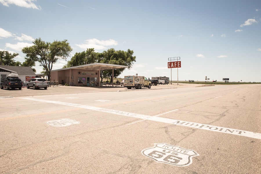 … im Midpoint Cafe in Adrian, Texas. Adrian, Texas? Aha, nie gehört – wird so mancher sagen, der die Route 66 nicht kennt. Aber jeder, der sie kennt, weiß auch, dass der kleine Ort in Texas, gelegen im sogenannten Panhandle, genau die halbe Strecke der Route 66 zwischen Chicago und Los Angeles markiert. Genauer gesagt, liegt der „Mittelstrich“ direkt vor dem Midpoint Cafe. Und hier steht das berühmte Schild. 1139 Meilen nach Los Angeles – nach links und 1139 Meilen nach Chicago – nach rechts.