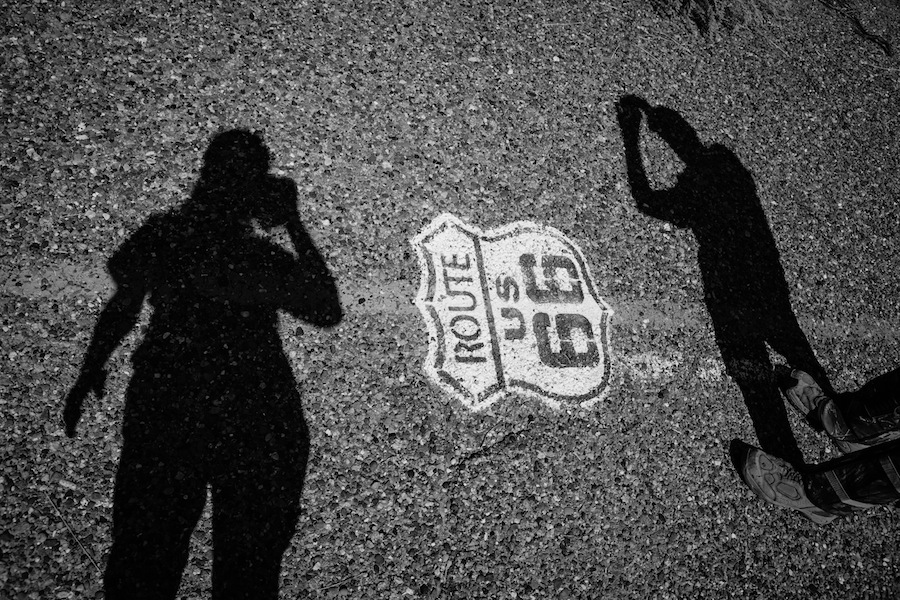 Ein kurzes Stück weiter dann ein echtes Teil der Old Route 66 komplett mit alter Fahrbahndecke und gelbem Mittelstreifen. Dass auch noch ein Route 66 Emblem aufgepinselt ist, verdanken wir „Roamin Rich“, einem ewigen Route 66 Reisenden, der überall dort die schwarz-weißen Symbole mittels einer Schablone anbringt, wo er darf und wo es sich tatsächlich um die alte 66 handelt. So auch hier. Auf dem unteren Bild sieht man die paralell verlaufende Eisenbahntrasse.