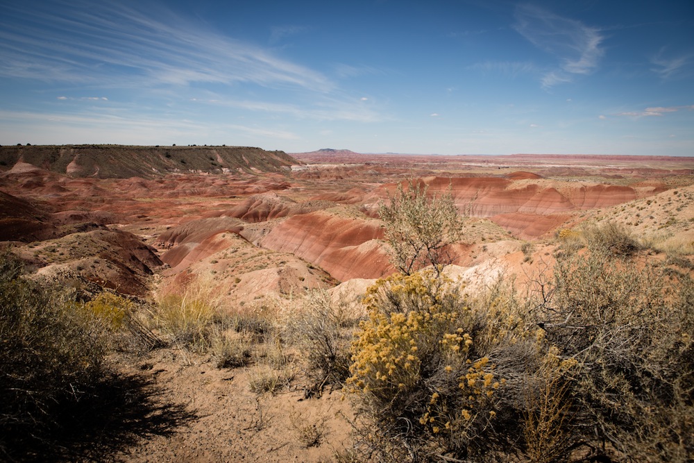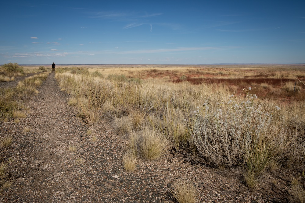 Jetzt ist es nicht mehr weit bis zum Petrified Forest National Park und der Painted Desert. Die 66 führte einstmals direkt durch den Nationalpark. An der Hauptroute durch den Park nehmen die Besucher nur ein altes Autowrack und einen „Marker“ wahr, der an die Route 66 erinnert. Man muss wissen, dass noch ein ganz schön langes Originalstück der 66 im Park erhalten ist, allerdings kann man es nur mit Genehmigung besichtigen, da es sich im „No Public Access“ Bereich des Parks befindet. Nick hat die Genehmigung besorgt und so steht uns einmal mehr ein langer Fußmarsch bevor. Genauer gesagt vom Parkplatz am Tiponi Point, von dem man einen herrlichen Ausblick auf die „Painted Desert“ genießen kann, bis zum einem Tor an der Parkgrenze.