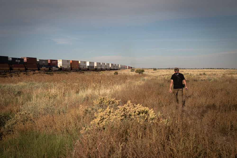 Nach einer guten Viertelstunde stapfen wir durch‘s hohe Gras und einmal mehr querfeldein zurück zu den Autos. Als nächstes gilt es noch ein paar alte Route 66 Abschnitte zu finden, die zwischen der Interstate und den fast parallel verlaufenden Bahngeleisen im hohen Gras fast verschwinden.