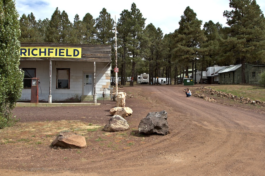 Eine dieser Tankstellen ist die Richfield Station direkt beim Pine Breeze Motel. Noch immer hängt ein kleines Easy Rider Filmplakat im Fenster. Und wenn man durch die im Laufe der Zeit fast blind gewordenen Fensterscheiben ins Innere schaut, erblickt man ein paar Getränkeautomaten, eine alte Registrierkasse, eine Kühltruhe und einige andere Relikte aus vergangenen Tagen. Eine der ursprünglichen Zapfsäulen ist noch erhalten und rostet unter dem Vordach vor sich hin.