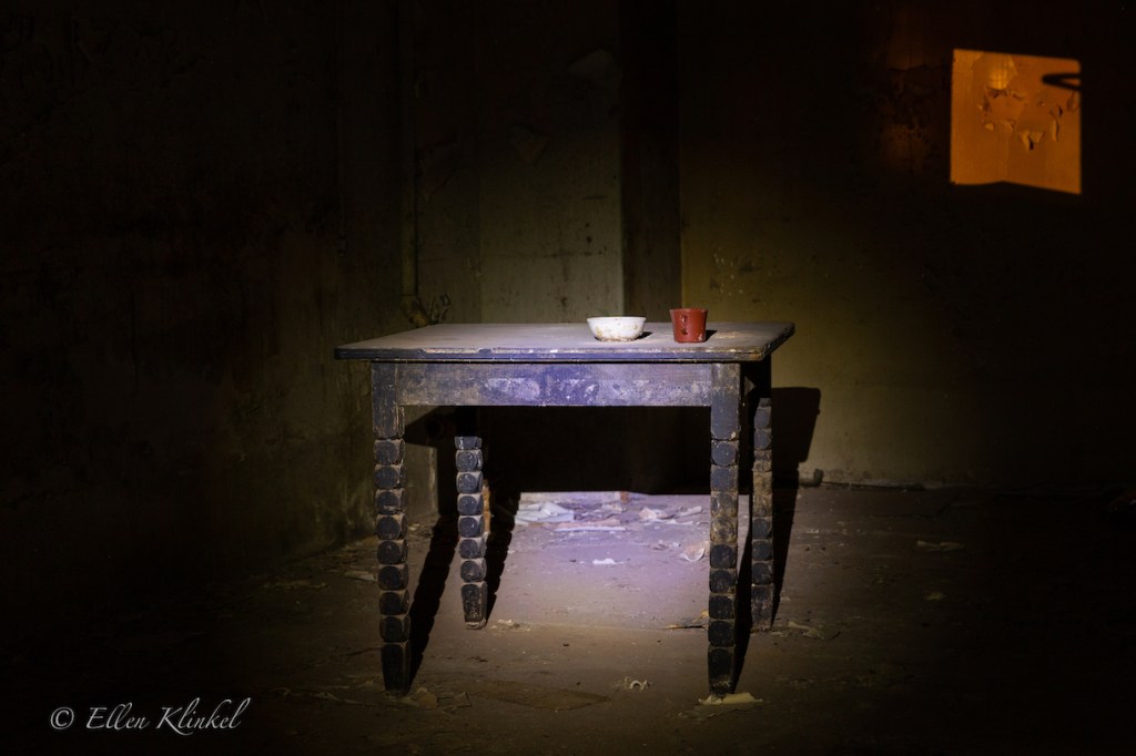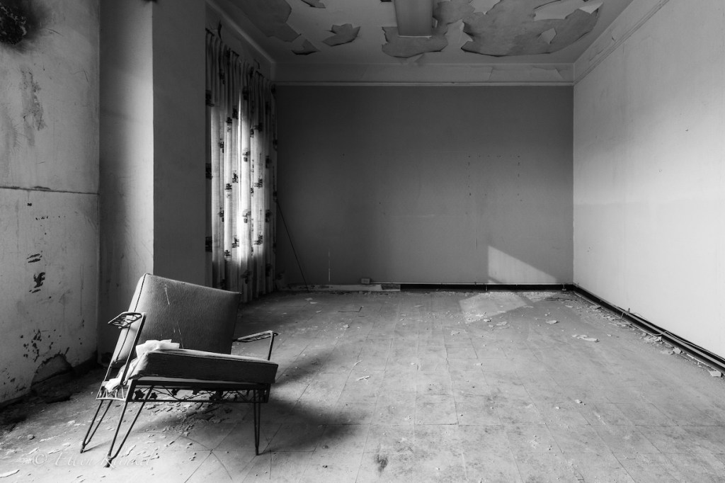 Von hier kann man die Lobby sehr schön überblicken. Bevor wir uns in Richtung der oberen Räume bewegen, noch ein paar Abstecher in die umliegenden Räumlichkeiten. In die ehemaligen Küchenräume sind noch beleuchtet. Der Putz blättert von Wänden und Decken, überall liegt irgendwas herum. Plastikbehälter, Papiertüten, ein paar verrottete Tische und Stühle, ein Einkaufswagen, ein Kleiderbügel.